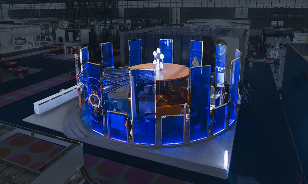 本次鐘表展,雷諾表突破以往封閉式的空間設(shè)計(jì),以全新的垂立藍(lán)色通透亞克力作為展廳的主要裝飾,使得整個展廳充滿通透感又充極具科技特質(zhì)。展廳設(shè)計(jì)為圓形,與腕表表盤的形狀相呼應(yīng),整個展廳展臺以腕表中一到十二的羅馬數(shù)字形式呈現(xiàn)。令觀展者仿佛置身于表盤之中,體驗(yàn)奇妙的空間感,穿梭于時空之中。