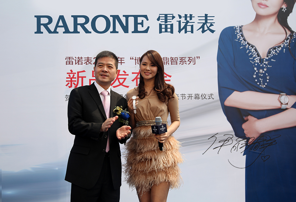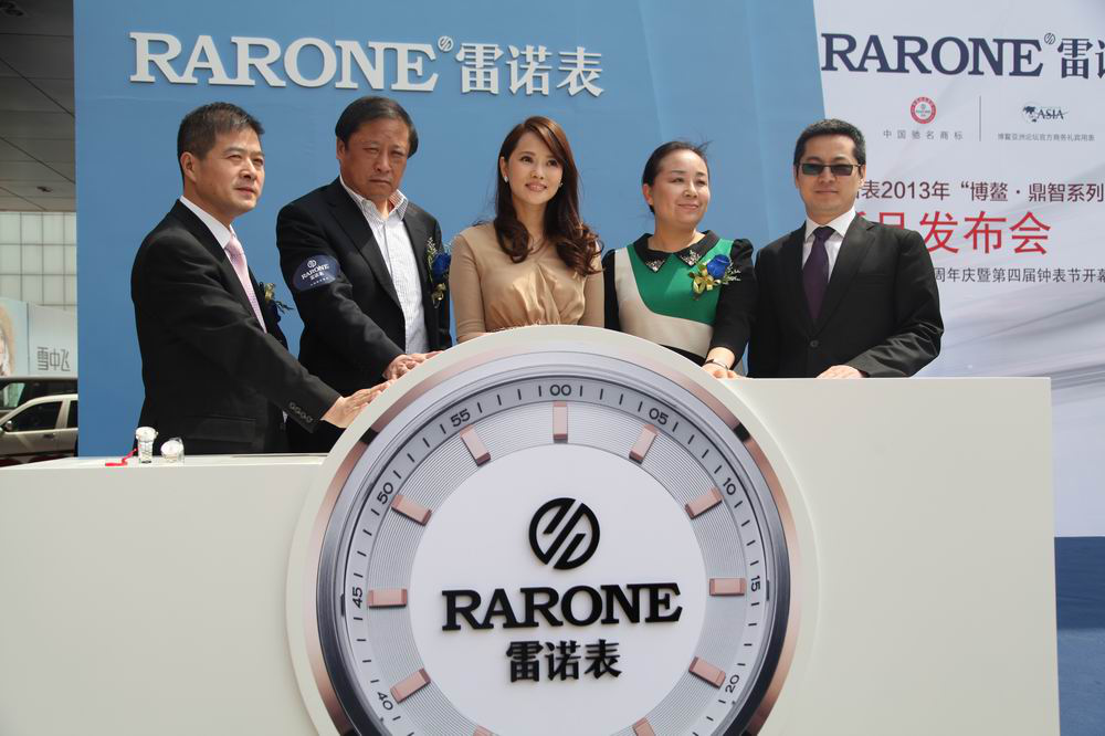 左起:雷諾表業(yè)總經(jīng)理詹江洲先生;唐百大集團(tuán)董事、總裁王維柯先生、副總裁孟瑞軍女士;雷諾表業(yè)營銷總監(jiān)程兵先生與伊能靜一起為新品上市揭幕