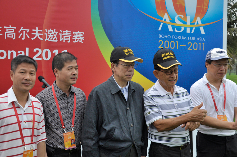 雷諾表業(yè)董事長詹西洲先生(左一)、總經(jīng)理詹江洲先生(左二)與博鰲亞洲論壇理事長 日本前首相福天康夫(中);博鰲亞洲論壇前任前理事長、菲律賓前總統(tǒng)拉莫斯(右二)一同參加博鰲高爾夫邀請賽