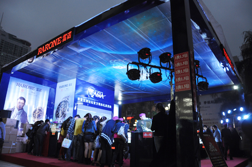 商務藍是雷諾表的品牌顏色,本次巡展活動的舞臺通過燈光、音響及平面廣告的綜合效果,營造出一種夢幻的藍天視覺效果,再搭配現(xiàn)場營業(yè)員和服務人員的空姐造型,使顧客仿佛置身于翱翔藍天的飛機艙,享受著雷諾表提供的高端商務服務。這也正是雷諾表作為商務手表品牌為顧客呈現(xiàn)的大品牌形象。