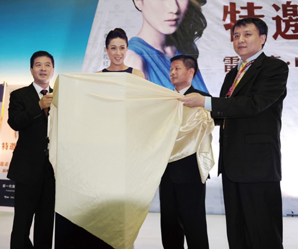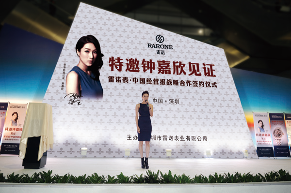 當(dāng)天,鐘嘉欣現(xiàn)身雷諾“古典話筒”展館,引爆現(xiàn)場(chǎng)高潮氣氛,成為整個(gè)展覽的焦點(diǎn),秒殺不少菲林。下午5時(shí),鐘嘉欣佩戴雷諾贈(zèng)送的手表,與雷諾表業(yè)董事長(zhǎng)詹西洲、總經(jīng)理詹江洲、《中國經(jīng)營(yíng)報(bào)》社長(zhǎng)韓曦晨共同揭開“藝術(shù)之旅”系列新表款的神秘面紗,正式對(duì)外發(fā)布這一全新系列的新表款。